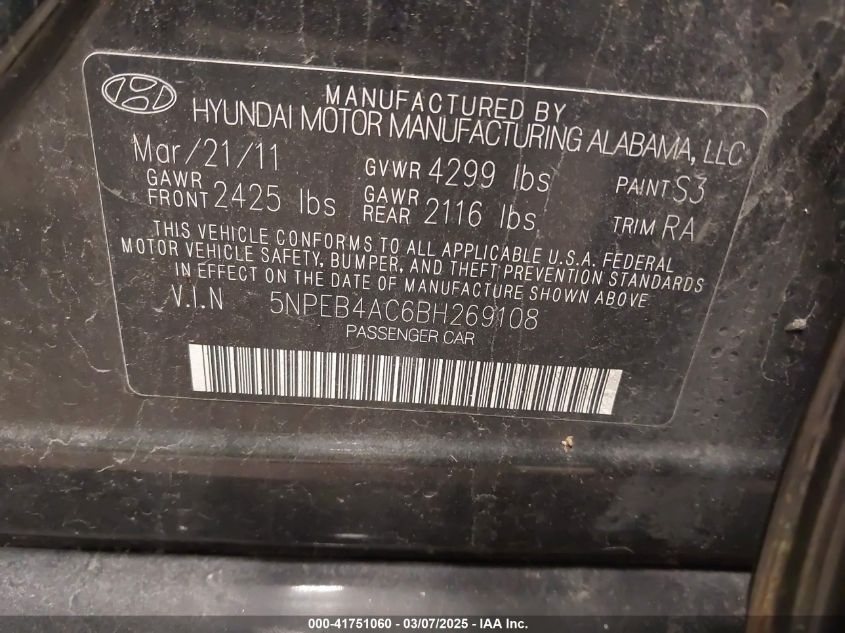 Color BlackCylinders 4Drive Front wheel driveVIN 5NPEB4AC6BH******State Run & Drive VerifiedDamage Front or backAuction date 2025-03-25 AutoRIA