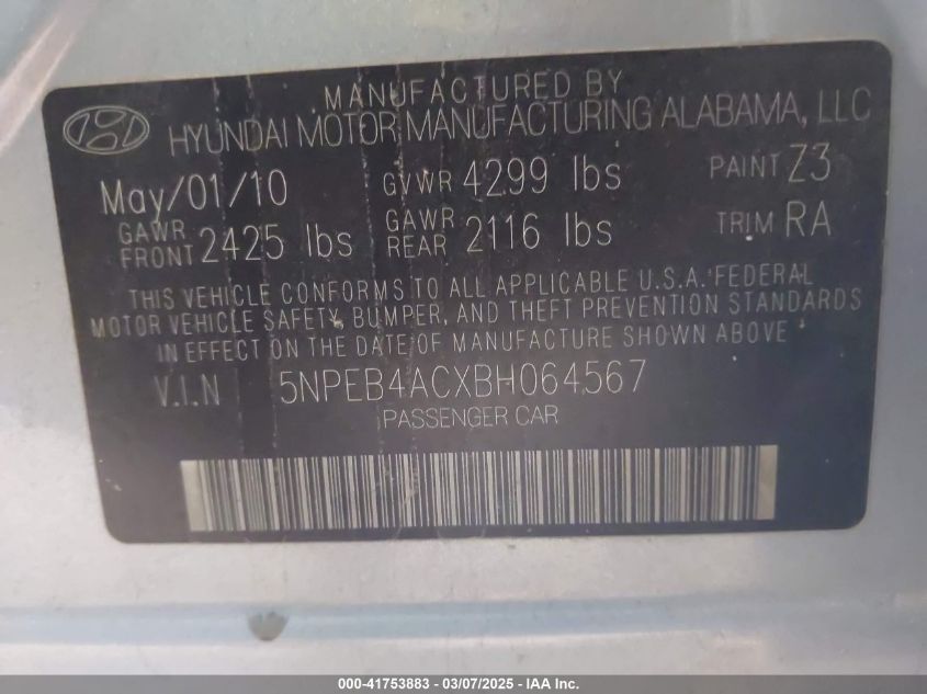 2011 HYUNDAI SONATA 2011 Gasoline, 2.4, Front wheel drive, VIN - 5NPEB4ACXBH****** from the USA