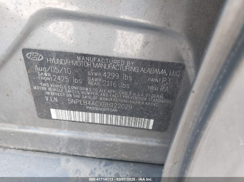 Color GrayCylinders 4Drive Front wheel driveVIN 5NPEB4ACXBH******State Run & Drive VerifiedDamage Front right AutoRIA