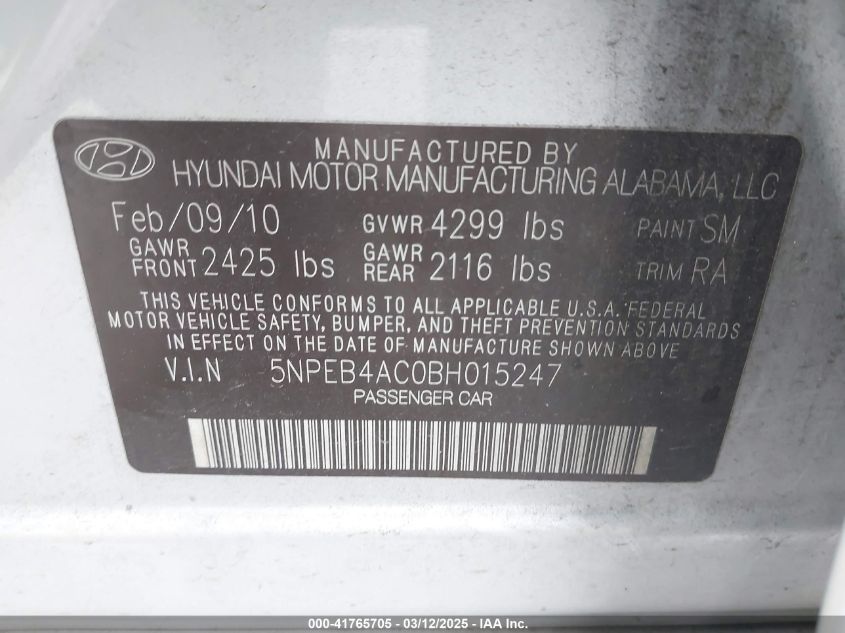 Color SilverCylinders 4Drive Front wheel driveVIN 5NPEB4AC0BH******State Run & Drive VerifiedDamage Vandalism AutoRIA