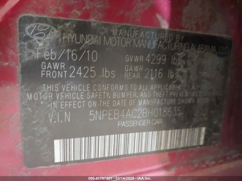 Color BurgundyCylinders 4Drive Front wheel driveVIN 5NPEB4AC2BH******State Run & Drive VerifiedDamage Back AutoRIA