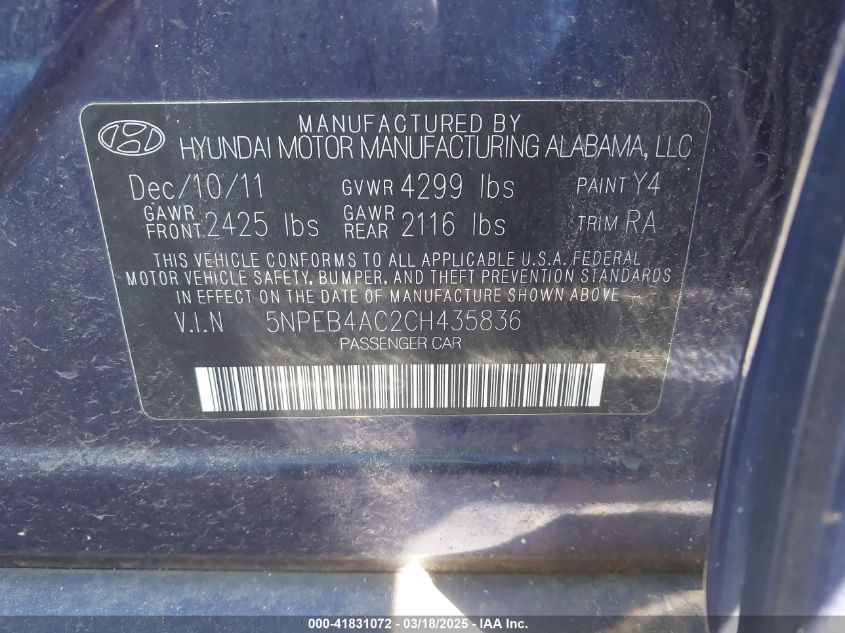 Color VioletCylinders 4Drive Front wheel driveVIN 5NPEB4AC2CH******State Run & Drive VerifiedDamage Front left AutoRIA