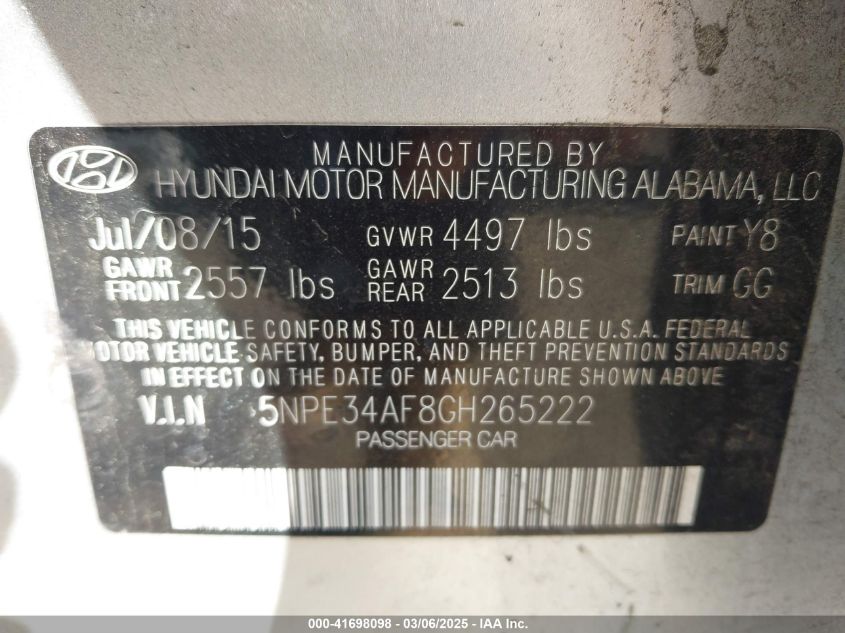Color SilverCylinders 4Drive Front wheel driveVIN 5NPE34AF8GH******State Run & Drive VerifiedDamage Front left AutoRIA