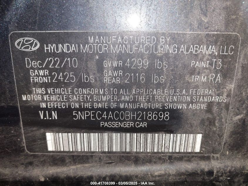 2011 HYUNDAI SONATA 2011 Gasoline, 2.4, Front wheel drive, VIN - 5NPEC4AC0BH****** from the USA