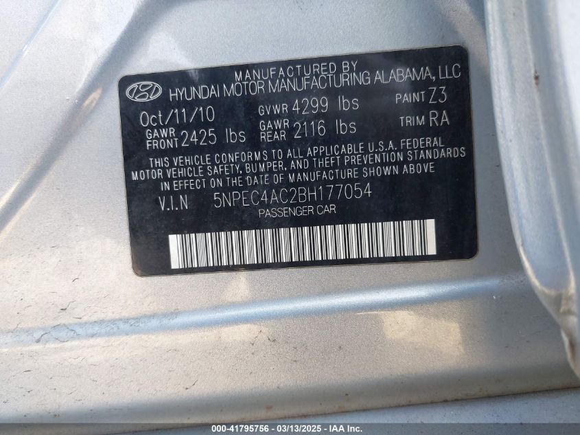 Color SilverCylinders 4Drive Front wheel driveVIN 5NPEC4AC2BH******State Run & Drive VerifiedDamage Front or back AutoRIA