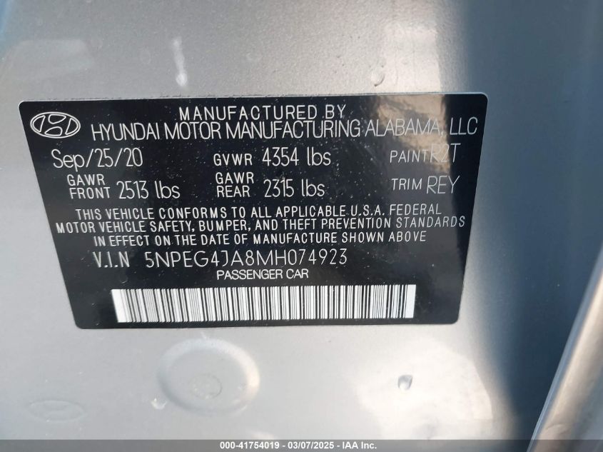 2021 HYUNDAI SONATA 2021 Gasoline, 2.5, Front wheel drive, VIN - 5NPEG4JA8MH****** from the USA