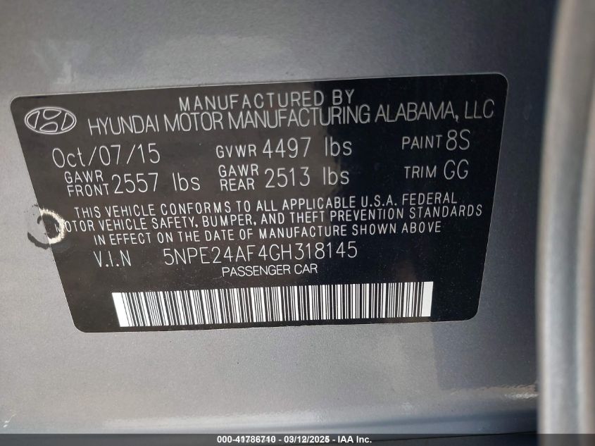 Color SilverCylinders 4Drive Front wheel driveVIN 5NPE24AF4GH******State Run & Drive VerifiedDamage Vandalism AutoRIA