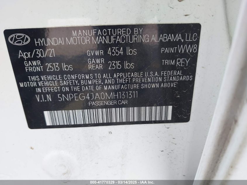 2021 HYUNDAI SONATA 2021 Gasoline, 2.5, Front wheel drive, VIN - 5NPEG4JA0MH****** from the USA