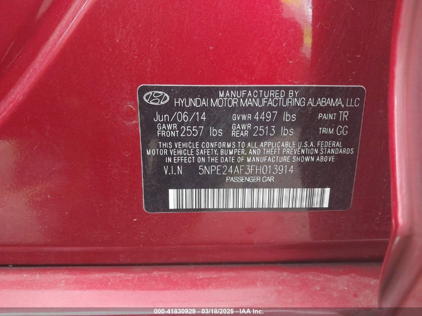 Color RedCylinders 4Drive Front wheel driveVIN 5NPE24AF3FH******State Run & Drive VerifiedDamage Vandalism AutoRIA