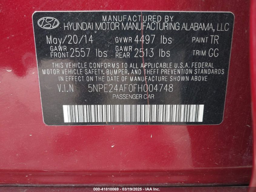Color RedCylinders 4Drive Front wheel driveVIN 5NPE24AF0FH******State Run & Drive VerifiedDamage Right side AutoRIA