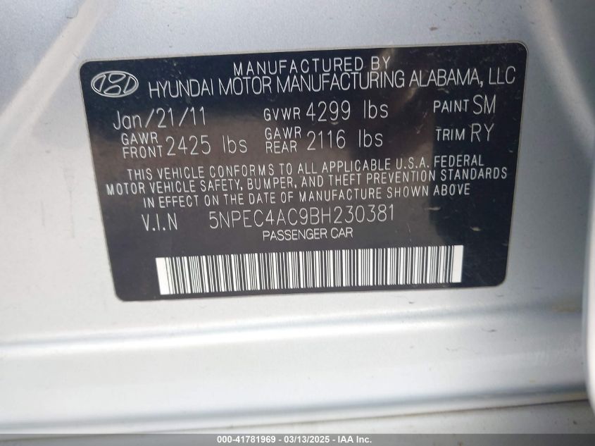 Color SilverCylinders 4Drive Front wheel driveVIN 5NPEC4AC9BH******State Run & Drive VerifiedDamage Front right AutoRIA