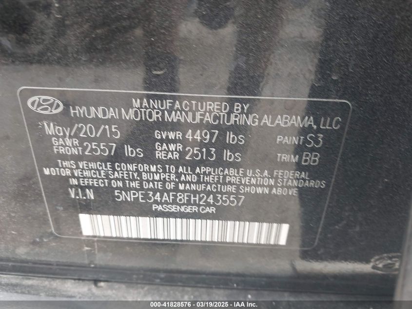 2015 HYUNDAI SONATA 2015 Gasoline, 2.4, Front wheel drive, VIN - 5NPE34AF8FH****** from the USA