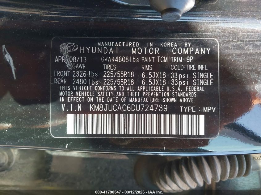 Color BlackCylinders 4Drive Full driveVIN KM8JUCAC6DU******State Run & Drive VerifiedDamage Right sideAuction date 2025-03-20 AutoRIA