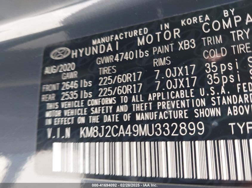 2021 HYUNDAI TUCSON 2021 Gasoline, 2.0, Full drive, VIN - KM8J2CA49MU****** from the USA