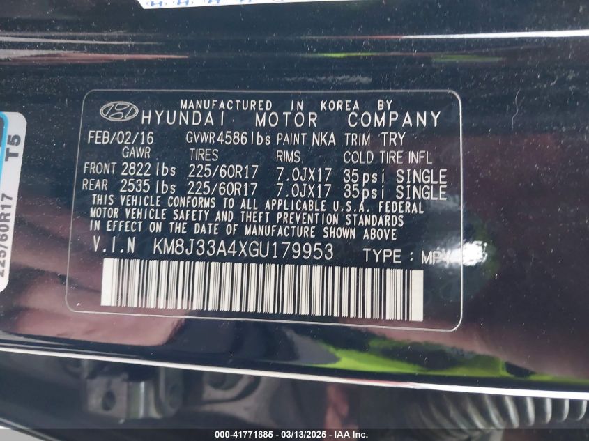 Color BlackCylinders 4Drive Front wheel driveVIN KM8J33A4XGU******State Run & Drive VerifiedDamage All over the car AutoRIA