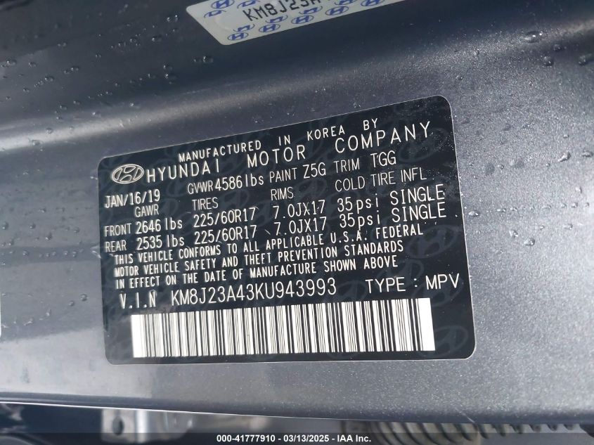 2019 HYUNDAI TUCSON 2019 Gasoline, 2.0, Front wheel drive, VIN - KM8J23A43KU****** from the USA