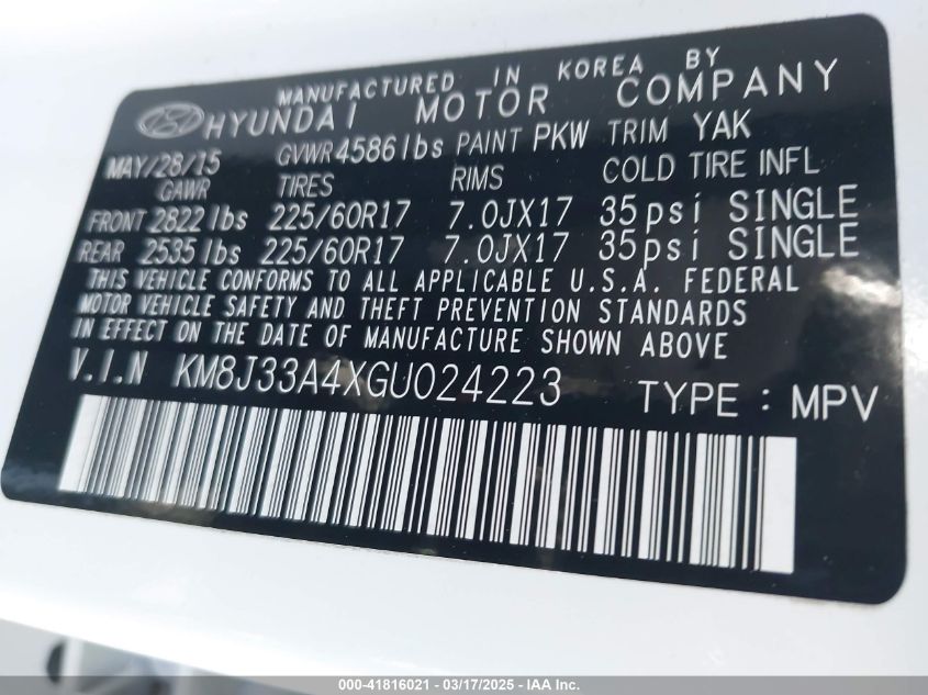 2016 HYUNDAI TUCSON 2016 Gasoline, 2.0, Front wheel drive, VIN - KM8J33A4XGU****** from the USA