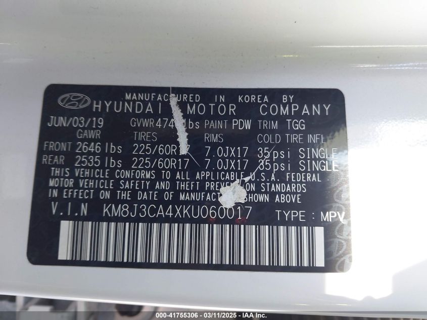 Color WhiteCylinders 4Drive Full driveVIN KM8J3CA4XKU******State Run & Drive VerifiedDamage Rear right AutoRIA
