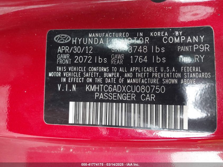 Color RedCylinders 4Drive Front wheel driveVIN KMHTC6ADXCU******State Run & Drive VerifiedDamage Front leftAuction date 2025-03-24 AutoRIA