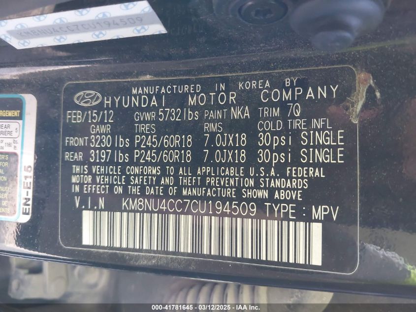Color BlackCylinders 6Drive Front wheel driveVIN KM8NU4CC7CU******State Run & Drive VerifiedDamage Back