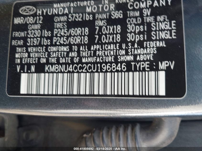 Color GrayCylinders 6Drive Front wheel driveVIN KM8NU4CC2CU******State Run & Drive VerifiedDamage Front or back
