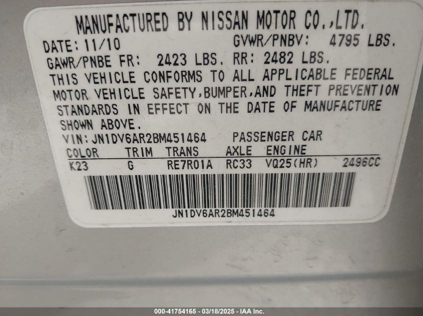 Color SilverCylinders 6Drive Full driveVIN JN1DV6AR2BM******State Run & Drive VerifiedDamage Front or back AutoRIA