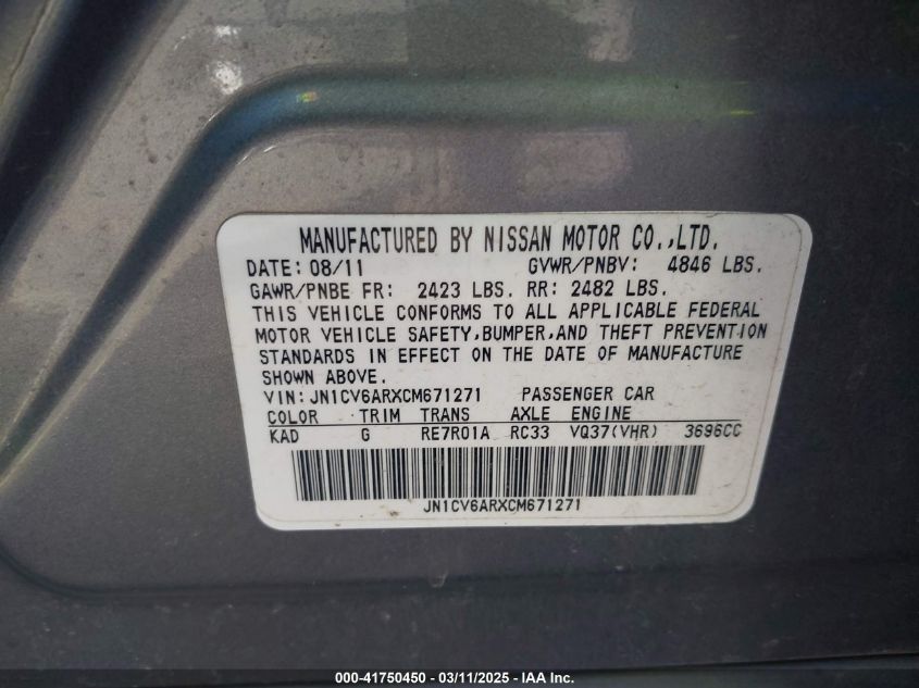 Color GrayCylinders 6Drive Full driveVIN JN1CV6ARXCM******State Run & Drive VerifiedDamage Front and back AutoRIA