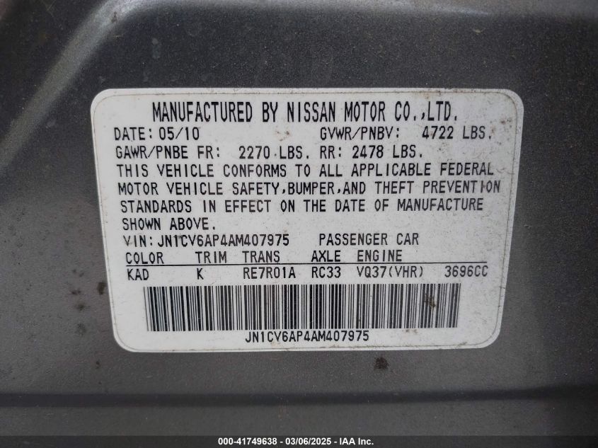 Color GrayCylinders 6Drive Rear wheel driveVIN JN1CV6AP4AM******State Run & Drive VerifiedDamage Front rightAuction date 2025-03-20 AutoRIA