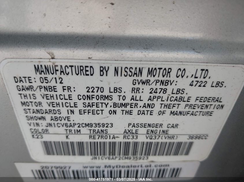 Color SilverCylinders 6Drive Rear wheel driveVIN JN1CV6AP2CM******State Run & Drive VerifiedDamage Back AutoRIA