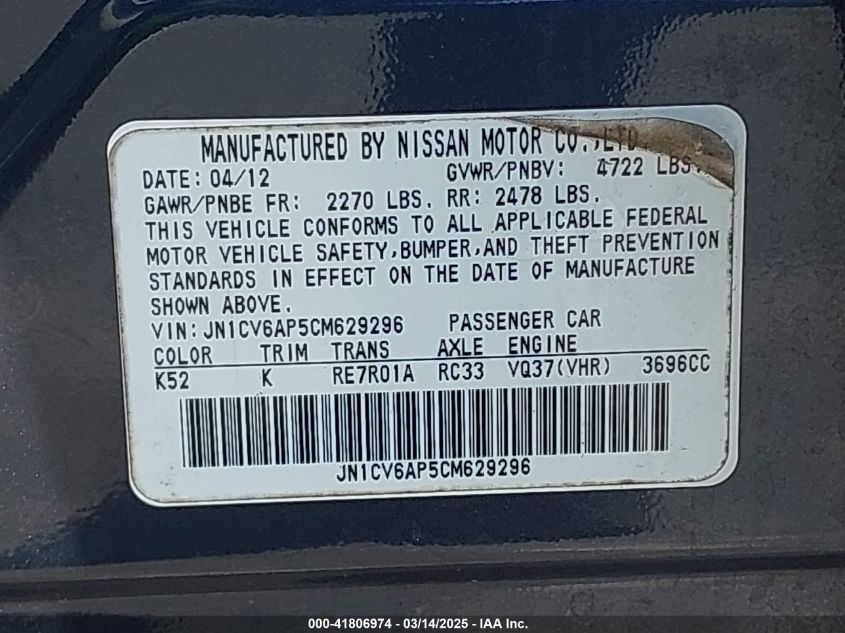 Color GrayCylinders 6Drive Rear wheel driveVIN JN1CV6AP5CM******State Run & Drive VerifiedDamage WaterAuction date 2025-03-20 AutoRIA