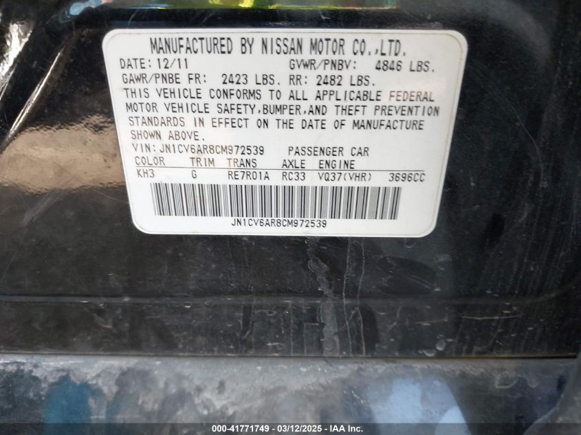 Color BlackCylinders 6Drive Full driveVIN JN1CV6AR8CM******State Run & Drive VerifiedDamage Bio/Chemical AutoRIA