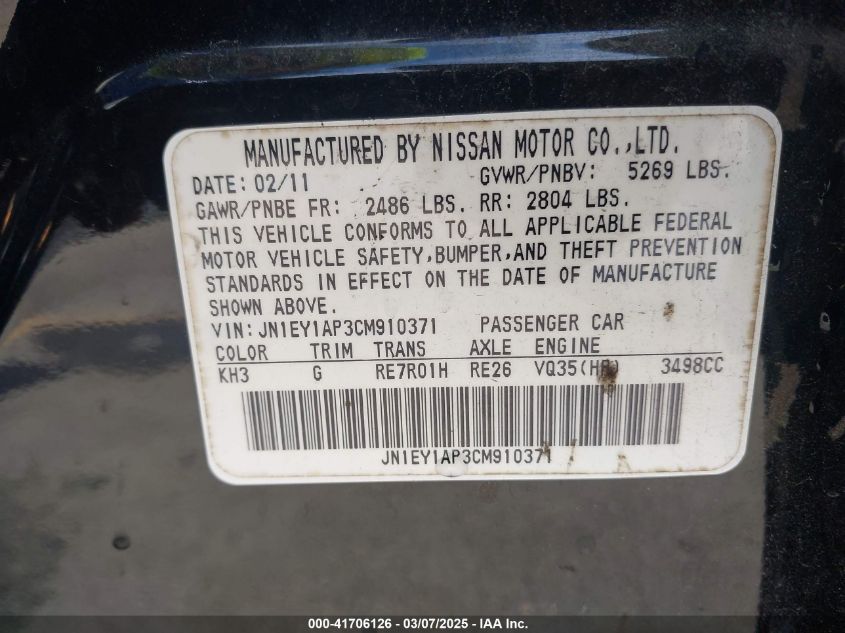Color BlackCylinders 6Drive Rear wheel driveVIN JN1EY1AP3CM******State Run & Drive VerifiedDamage Left side