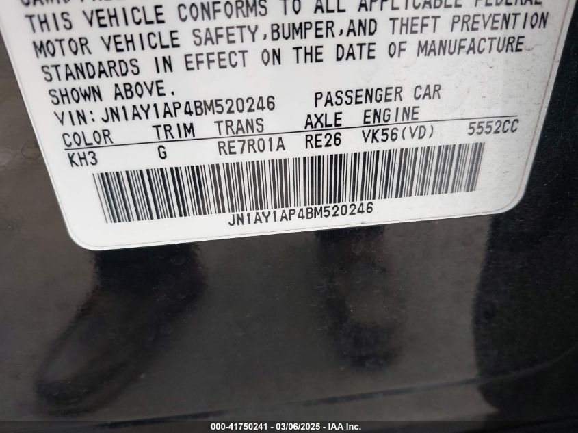 Color BlackCylinders 8Drive Rear wheel driveVIN JN1AY1AP4BM******State Run & Drive VerifiedDamage Right side
