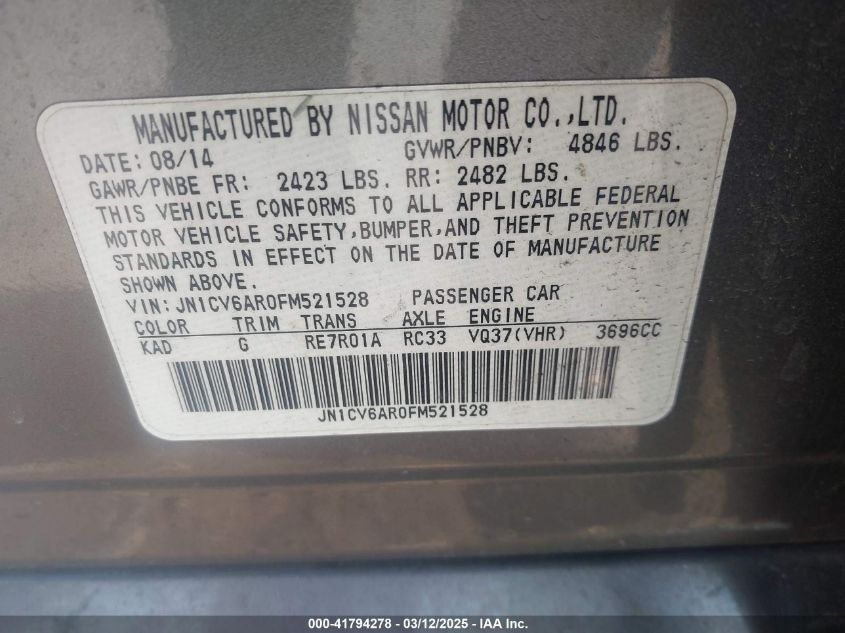 Color GrayCylinders 6Drive Full driveVIN JN1CV6AR0FM******State Run & Drive VerifiedDamage Front or backAuction date 2025-03-21