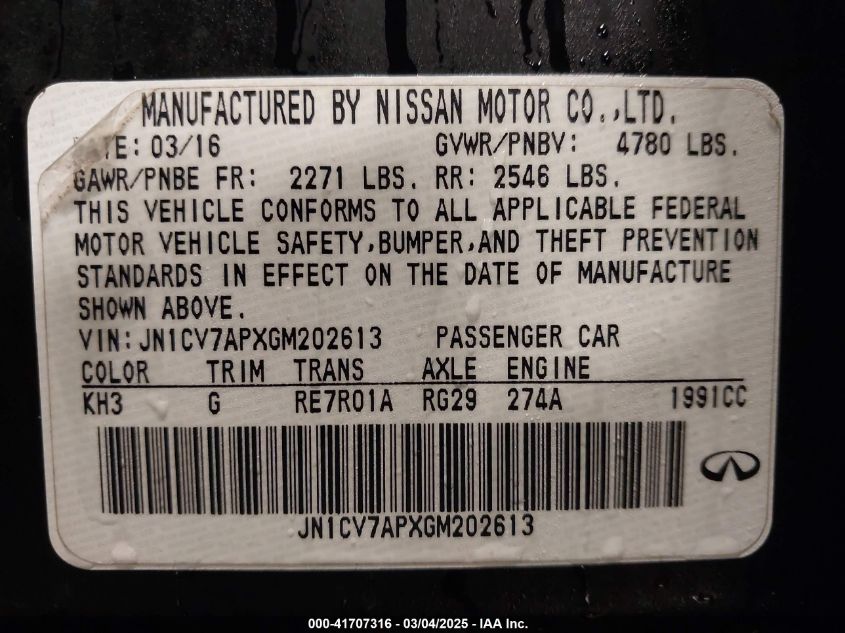 Color BlackCylinders 4Drive Rear wheel driveVIN JN1CV7APXGM******State Run & Drive VerifiedDamage Front or backAuction date 2025-03-20 AutoRIA