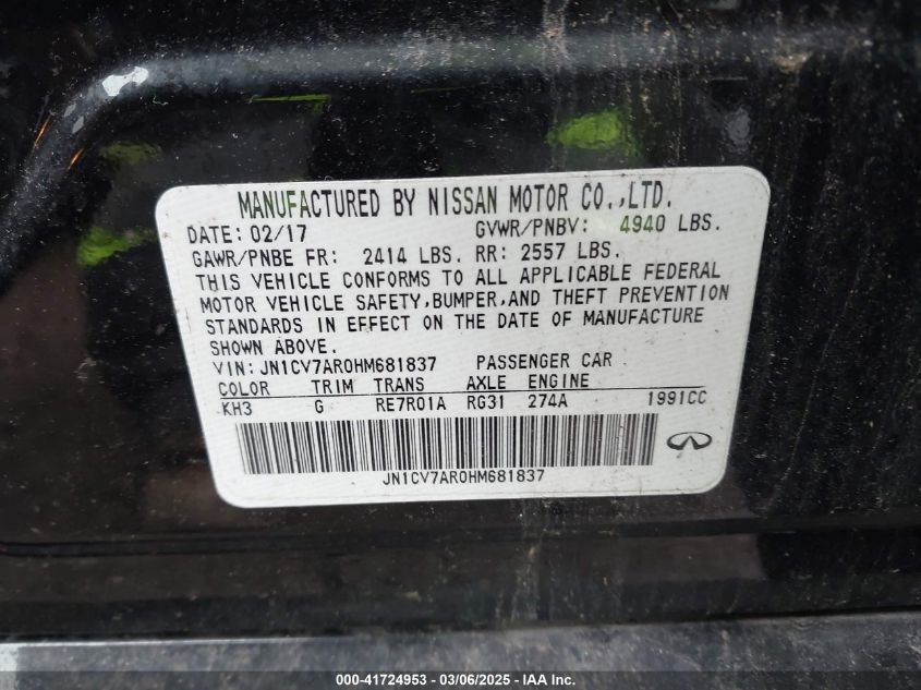 Color BlackCylinders 4Drive Full driveVIN JN1CV7AR0HM******State Run & Drive VerifiedDamage Right sideAuction date 2025-03-20 AutoRIA
