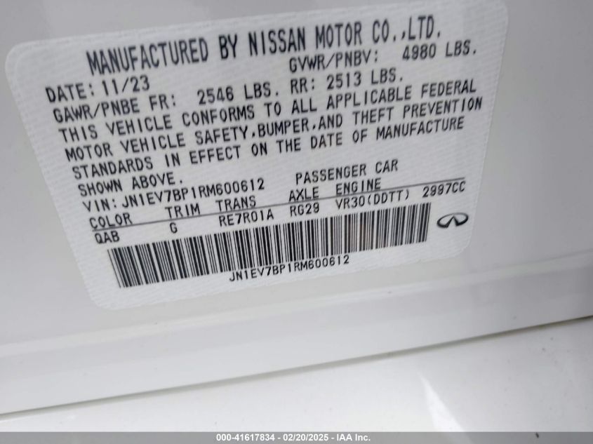 Color WhiteCylinders 6Drive Rear wheel driveVIN JN1EV7BP1RM******State Run & Drive VerifiedDamage Left side
