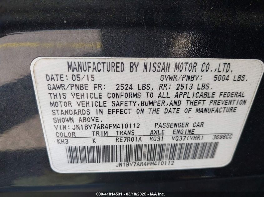 Color BlackCylinders 6Drive Full driveVIN JN1BV7AR4FM******State Run & Drive VerifiedDamage Front leftAuction date 2025-03-20 AutoRIA