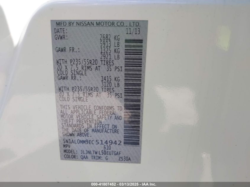 Color WhiteCylinders 6Drive Full driveVIN 5N1AL0MM9EC******State Run & Drive VerifiedDamage Rear leftAuction date 2025-03-20 AutoRIA