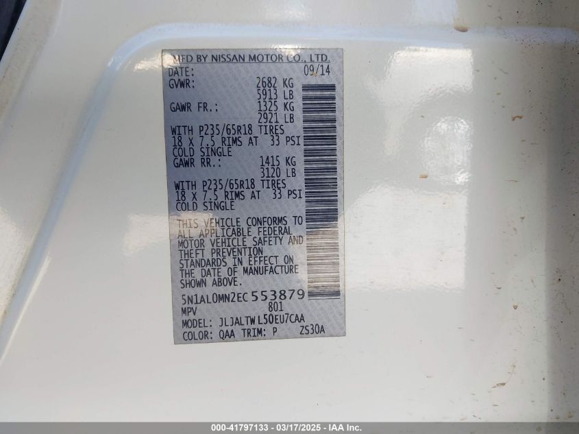 Color WhiteCylinders 6Drive Front wheel driveVIN 5N1AL0MN2EC******State Run & Drive VerifiedDamage InsignificantAuction date 2025-03-20 AutoRIA