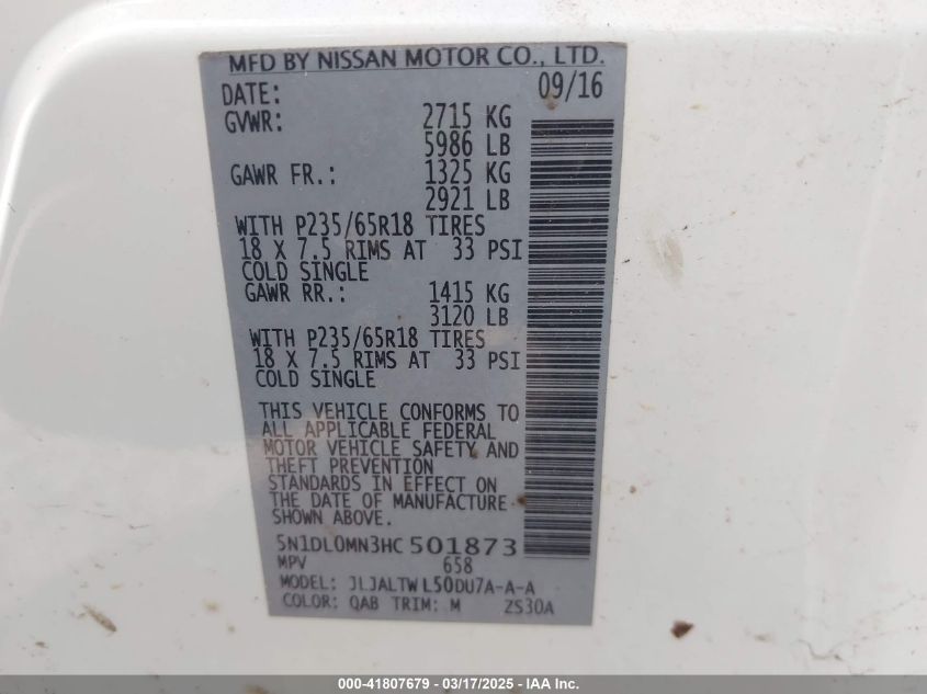 Color WhiteCylinders 6Drive Front wheel driveVIN 5N1DL0MN3HC******State Run & Drive VerifiedDamage Front leftAuction date 2025-03-24 AutoRIA