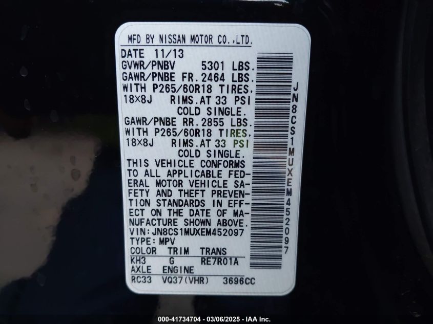 Color BlackCylinders 6Drive UnknownVIN JN8CS1MUXEM******State Run & Drive VerifiedDamage Right side AutoRIA