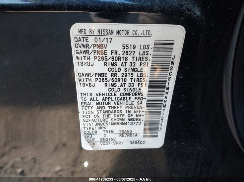Color BlackCylinders 6Drive Full driveVIN JN8CS1MW8HM******State Run & Drive VerifiedDamage Front or backAuction date 2025-03-25 AutoRIA