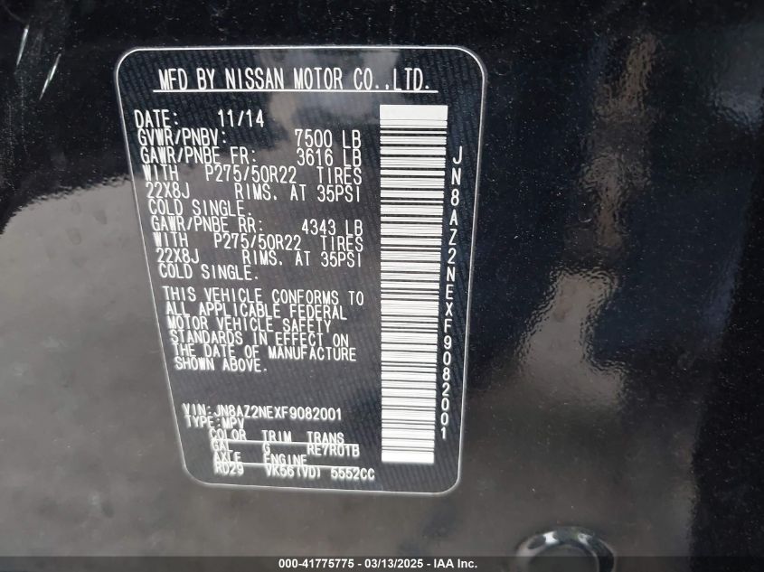 Color BlackCylinders 8Drive Full driveVIN JN8AZ2NEXF9******State Run & Drive VerifiedDamage InsignificantAuction date 2025-03-26 AutoRIA