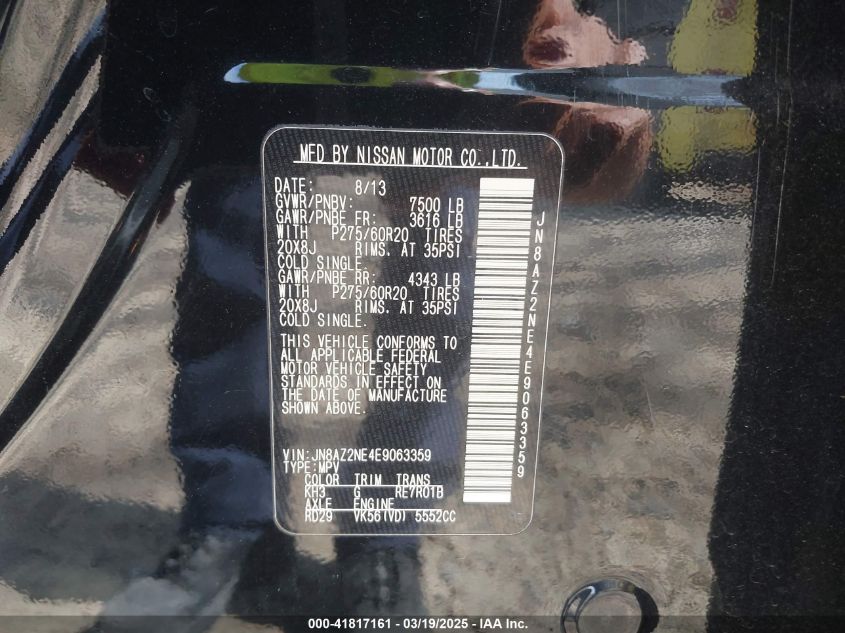 Color BlackCylinders 8Drive Full driveVIN JN8AZ2NE4E9******State Run & Drive VerifiedDamage Right side AutoRIA