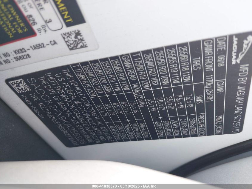 2019 JAGUAR F-PACE 2019 Gasoline, 2.0, Full drive, VIN - SADCK2FX9KA****** from the USA