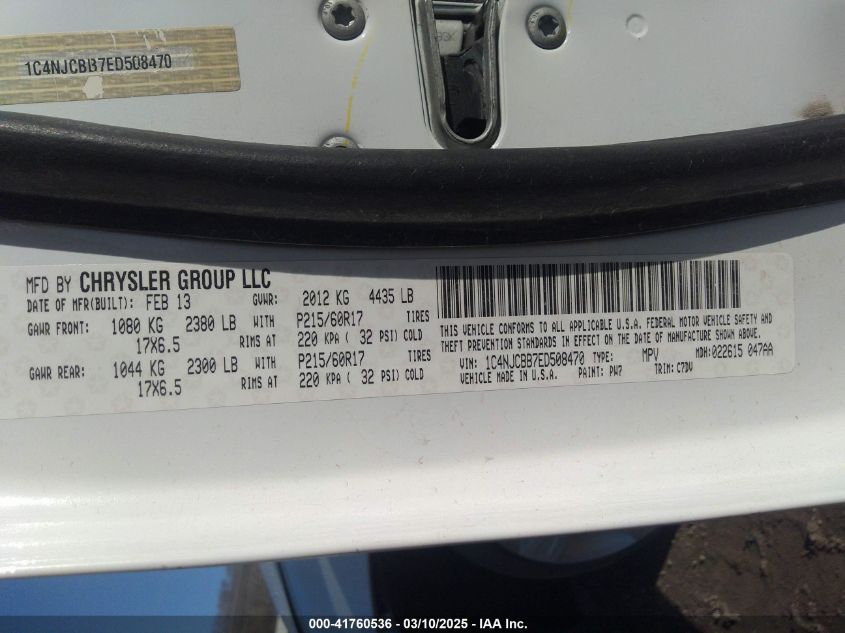 Color WhiteCylinders 4Drive Front wheel driveVIN 1C4NJCBB7ED******State Run & Drive VerifiedDamage Front left AutoRIA