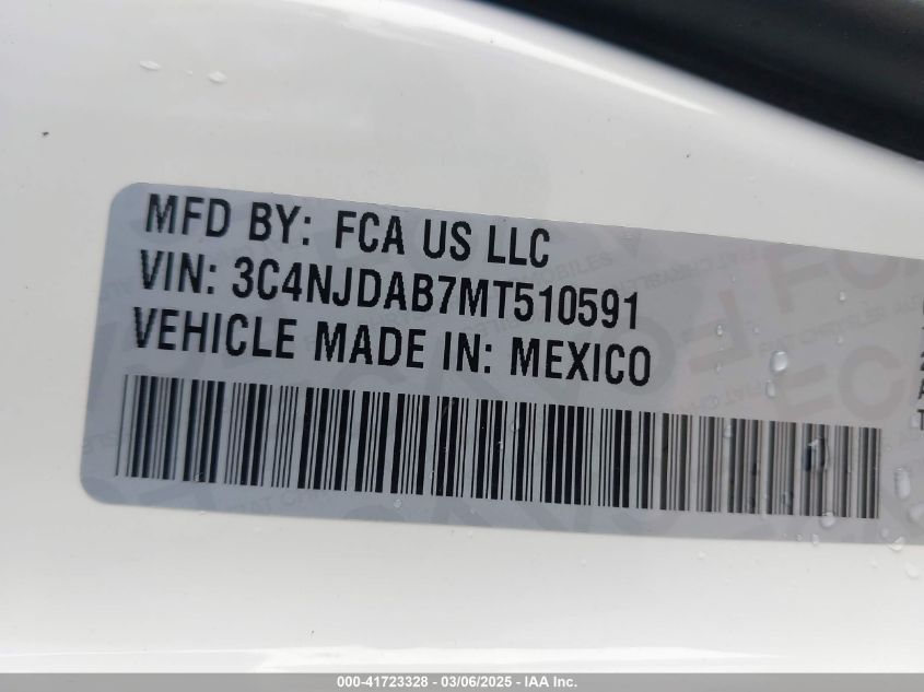 Color WhiteCylinders 4Drive Full driveVIN 3C4NJDAB7MT******State Run & Drive VerifiedDamage Front right AutoRIA