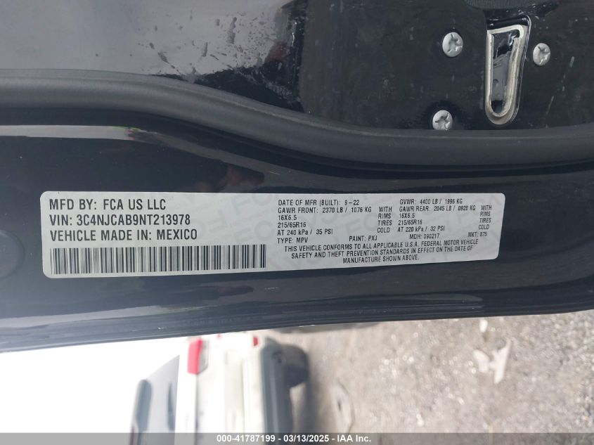 Color BlackCylinders 4Drive Front wheel driveVIN 3C4NJCAB9NT******State Run & Drive VerifiedDamage Back AutoRIA
