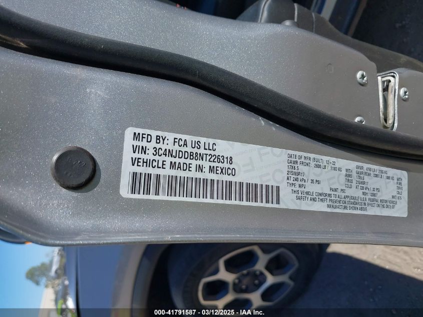 Color GrayCylinders 4Drive Full driveVIN 3C4NJDDB8NT******State Run & Drive VerifiedDamage Front and back AutoRIA